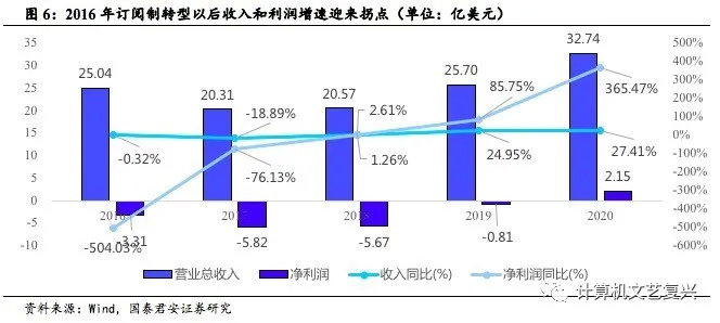 从财务指标上看,2016年转订阅制以后,收入和净利润恢复增长。2016-2019年,公司营收增速分别为-18.89%/ 1.26%/ 24.95%/ 27.41%,净利润增速分别为-76.13%/ 2.61%/ 85.75%/ 365.47%。存量用户和盗版用户的转化给公司带来了新的成长动力,后面我们会进一步分析。