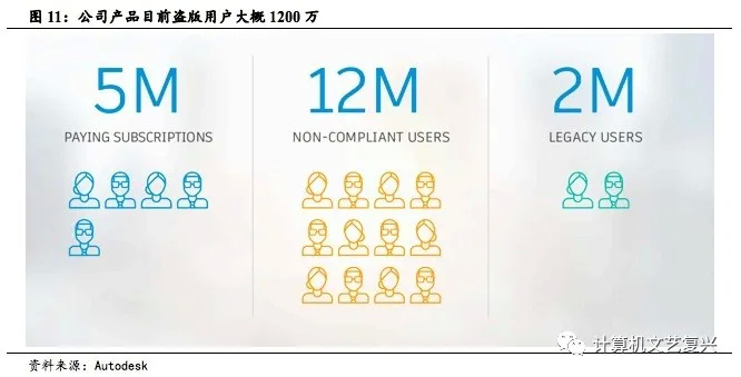 未来成长动力来源:盗版用户和传统License客户向订阅客户转化,建筑行业数字化转型以及设计和加工流程的融合。首先,从客户角度来看,根据Autodesk的统计,目前公司的付费订阅客户500万人,盗版用户1200万人,传统License客户200万人,因此还有1400万潜在客户数量可以转化为订阅客户。但是根据我们的产业调研,打击盗版并不是Autodesk的工作重心,实际上现在的1200万盗版用户里面其实很大一部分是Autodesk所纵容的,这些盗版用户使用着老版本的AutoCAD软件,但是为公司产品网络效应的形成立下了汗马功劳。第二,建筑行业目前数字化程度还不高,未来随着行业数字化的不断渗透,设计类软件的空间也将打开。第三,未来在制造行业设计和加工两道工序将不断融合,带来数字化工具的进一步应用。