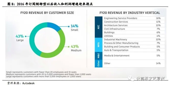 从收入结构上看,主要收入来自大中型企业。根据公司2020年报,43%收入来自大型企业(超过5000人),43%收入来自中型企业(20-50人),14%收入来自小型企业(少于20人)。从垂直行业收入分布来看,主要收入来自工程服务行业(16%)、房屋建筑行业(11%)、建筑设计行业(10%)和工程机械行业(10%)。