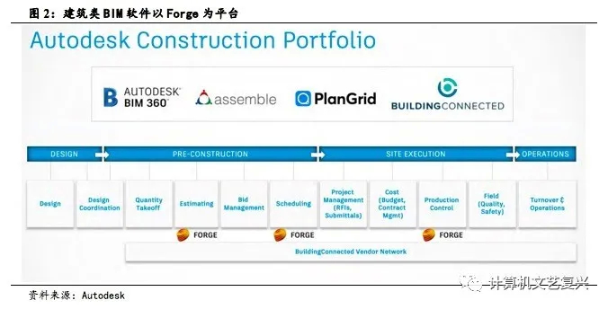 建筑类BIM软件以Forge为平台,打通全流程数据。Autodesk建筑类软件包括BIM360、revit、plangrid等,以Forge为平台,打通数据。Forge云平台是Autodesk 2015年推出的以数据为中心的云平台,它是专为开发者打造的PaaS云服务体系。Forge平台的主要模块包括文件查看器(可以查看超过50种格式的设计文件3D模型)、数据管理API(获取在第三方流程中生成物料清单的物料,ID和属性的有序结构)、模型产生API(可以从超过50种不同的行业标准格式制作查看器的文件、提取几何图形、检索元数据)、设计自动化API(利用Autodesk云端服务的功能,在设计文件上进行自动化流程制作)。