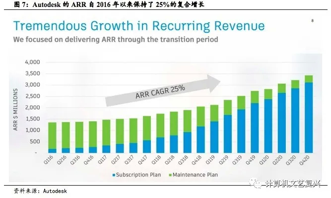 发展第五阶段:2016年至今,强力推动订阅制转型。2016年8月,Autodesk对产品方向做出了进一步的调整,将以往以制造业为重点设计的各类软件整合成了工程建设,产品设计和传媒娱乐三大领域并重的行业软件集,以此来分解行业风险。2016年开始,公司不再提供License销售服务,2017年6月启动了激励存量永久授权客户向订阅制转型的计划。2021年8月起将不再为存量永久授权客户提供维护。