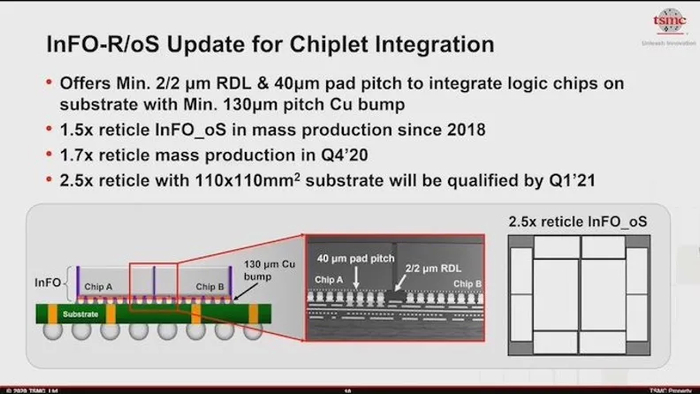 InFO-R(也称为InFO_oS)允许在芯片和微凸块之间添加重新分布层,以将多个芯片统一为一个封装。这是另一种技术,其限制因素是该技术的x / y尺寸(以标线片尺寸衡量)。自2018年以来,目前台积电以1.5倍标线支持InFO-R,并将在2020年第四季度升级到1.7倍标线,到2021年第一季度将达到2.5倍标线。
