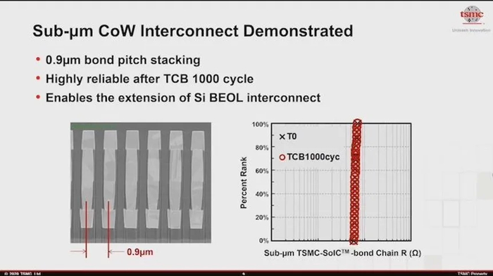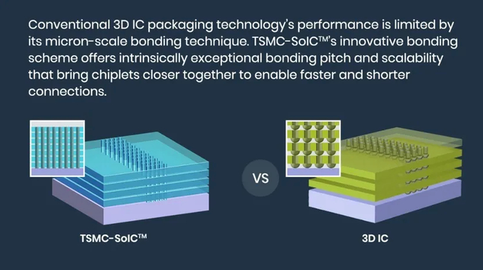 根据台积电的规划,这是他们面向未来集成的一项关键技术,它超越了过去的中介层或芯片堆叠的实现方式,因为它允许在不使用任何微凸点的情况下堆叠硅芯片,而直接将硅的金属层对准并键合到硅芯片上。