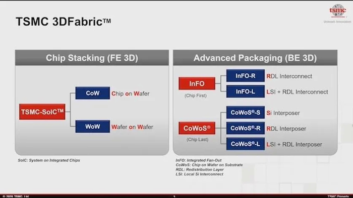 3DFabric作为一个品牌具有一定的意义,可以将台积电(TSM.US)提供的数十种封装技术结合在一起。从广义上讲,3DFabric分为两个部分:一方面是所有“前端”芯片堆叠技术,例如晶圆上芯片,而另一方面是“后端”封装技术,例如InFO(Integrated Fan-Out))和CoWoS(Chip-On-Wafer-On-Substrate)。