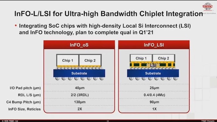 InFO-L与CoWoS-L相似之处在于,它使用局部硅互连将多个InFO die连接在一起。这项技术仍在开发中,预计将于2021年第一季度完成认证。