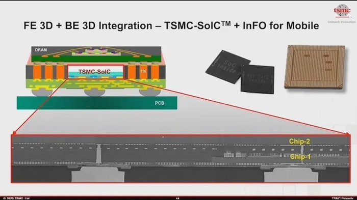TMSC的封装技术也可以结合在同一产品中。通过同时实现前端(SoIC)和后端(InFO)封装,可以制造出新的产品类别。该公司制作了一个这样的模型: