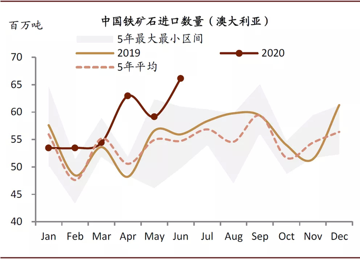 2020年上半年中国铁矿石进口量保持强劲,主要受益于自澳洲进口的增加。2020年1-6月我国共进口铁矿石5.47亿吨,同比增长9%,其中从澳大利亚进口铁矿石3.50亿吨,同比增长9%。但是受到矿难和公共卫生事件的影响,巴西铁矿生产相对落后,从巴西进口铁矿石0.95亿吨,同比下降了4%。