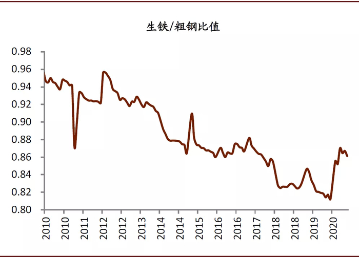 2020年上半年中国铁矿石进口量保持强劲。2020年1-6月我国累计进口铁矿石5.47亿吨,同比增长9%,其中从澳大利亚进口同比增长9%,从巴西进口同比下降了4%。2019年以来由于巴西矿难导致其出口量下降,2020年上半年我国进口的铁矿石中巴西矿份额由去年同期的20%下降至今年的17%,供给结构中更多的来自于澳洲、印度、俄罗斯和乌克兰等国家,进口铁矿中铝元素含量提升。中国铁矿石需求强劲,生铁产量保持高位带动铁矿需求。2020年上半年中国国内的铁矿石需求十分强劲,长流程钢厂连续生产。今年钢厂使用了更多的铁矿石,降低了废钢的使用,因为铁水相对废钢更具有经济性。我们一般用生铁/粗钢的比值来衡量钢铁生产中铁元素来自铁矿石的情况,2020年1~7月我国的生铁/粗钢比值明显高于2019年,表明钢厂增加了铁矿石的用量,降低了废钢的用量,2020年1-6月中钢协会员钢企废钢消费量同比下降4%。