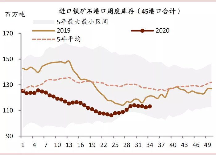 图表: 当前45港口进口铁矿石库存同比仍然处于低位