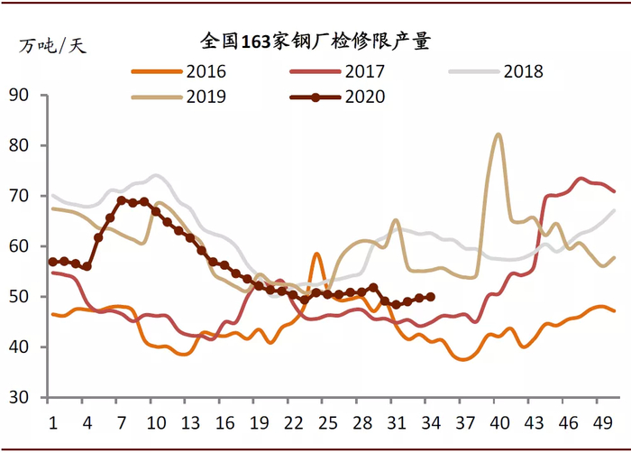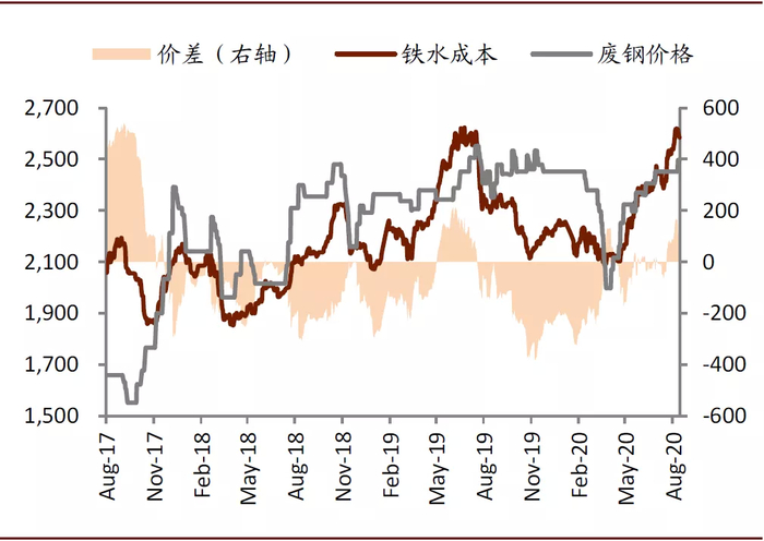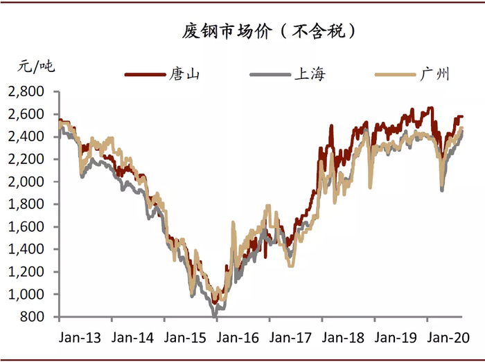 我们认为铁矿价格高企,铁水生产旺盛的背后是废钢的短缺,电炉产量快速上升。今年钢厂使用了更多的铁矿石,降低了废钢的使用,因为铁水相对废钢更具有经济性。我们一般用生铁/粗钢的比值来衡量钢铁生产中铁元素来自铁矿石的情况,2020年1~7月我国的生铁/粗钢比值明显高于2019年,这表明钢厂在生产的过程中增加了铁矿石的用量,降低了废钢的用量。2020年1-6月中钢协会员钢企废钢消费量3949万吨,同比下降4%,其中电炉消耗同比下降7%,转炉消耗同比下降4%。当前国内废钢供给紧张,废钢价格依然高企。