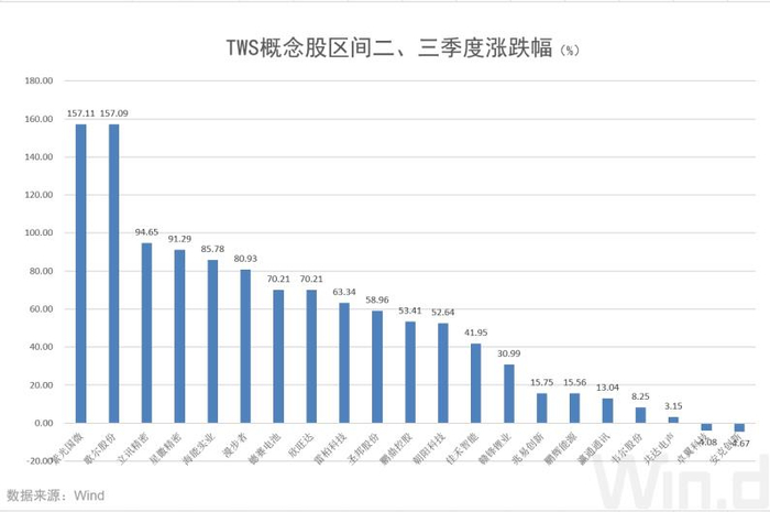 在业绩暴涨背后,股价也不含糊,在二、三季度中,TWS概念股纷纷大涨,整体上涨幅达到54.82%,上涨个股占比超九成,仅两只个股下跌。涨幅最大的是紫光国微、歌尔股份,股价都涨幅都超出了150%,立讯精密、星徽精密也有90%的涨幅,多数个股涨幅集中在30%-90%之间,这也印证了资本市场对于“耳机”概念股的青睐。