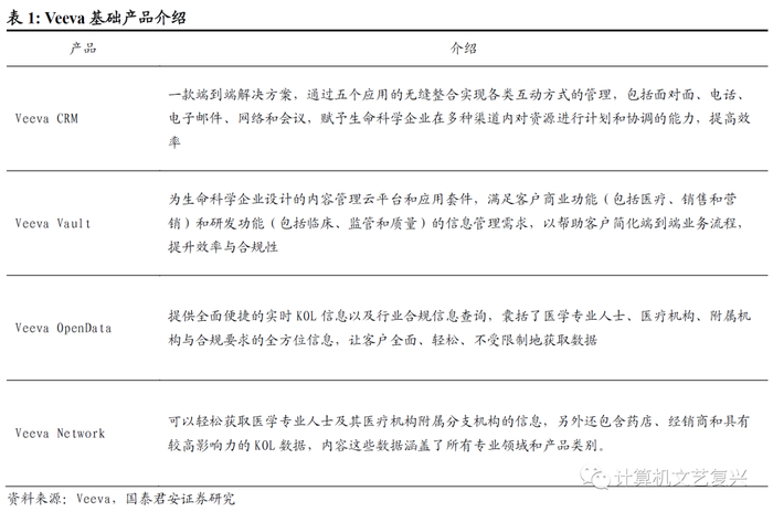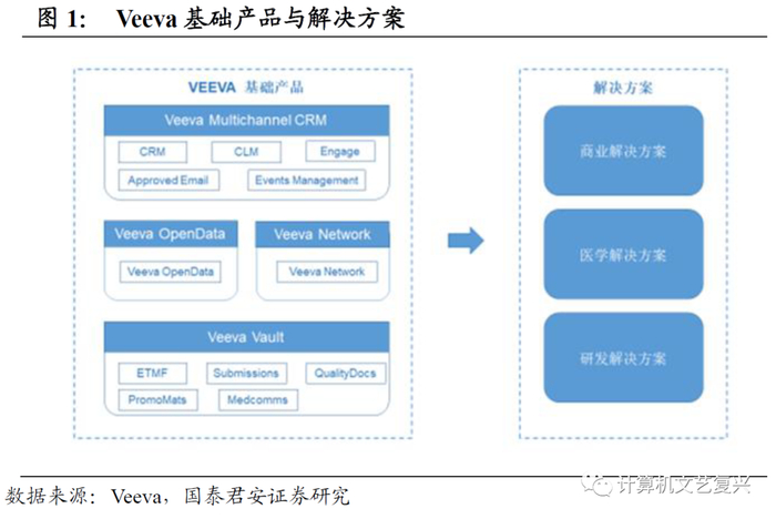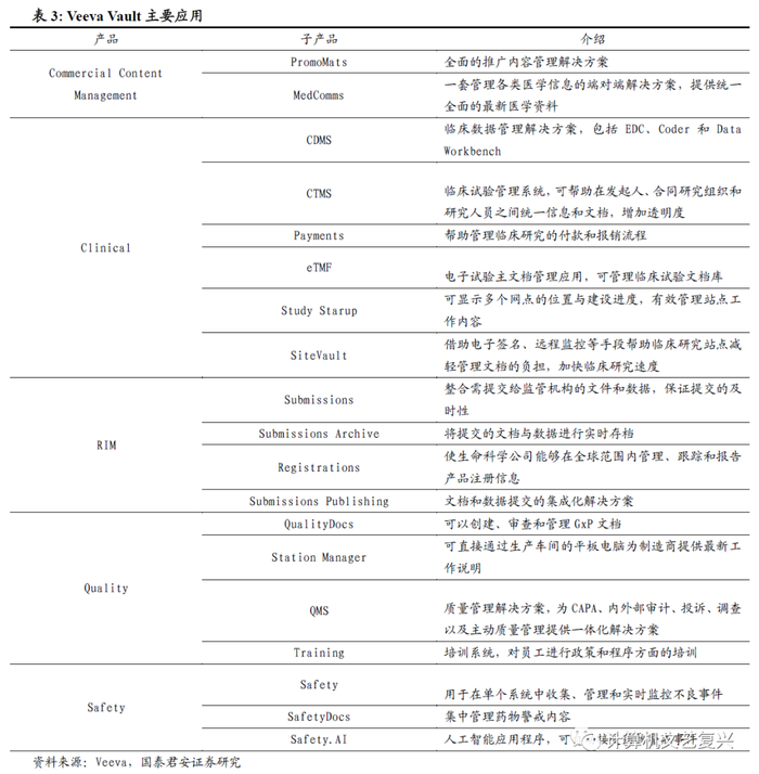 Veeva Systems (VEEV.US)2007年成立,是全球生命科学行业SaaS解决方案领导者。2007年,Veeva针对生命科学行业这一垂直领域提供基于SaaS模式的CRM(创始人有Salesforce(CRM.US)工作背景)。2012年,Veeva推出研发文档解决方案,为研发团队提供数据管理服务,开始横向扩展产品线。2013年,Veeva成功上市,登陆纳斯达克。2014年,Veeva推出商务云套件,打造研发、营销、销售、售后闭环解决方案,形成完整的多渠道营销解决方案。同年,Veeva上线Veeva Vault集成平台,至此形成Veeva商务云和Veeva vault两大主要产品。目前,Veeva市值已经突破100亿美元,成为垂直领域首个市值突破百亿美金的云服务商。