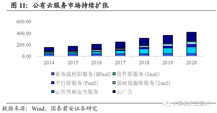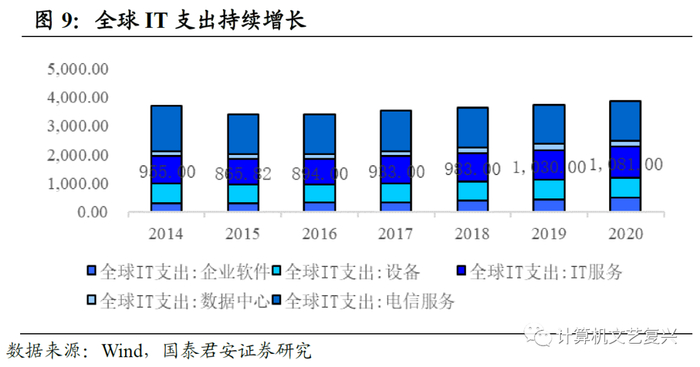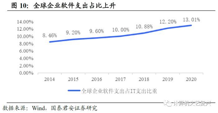 全球IT支出稳定增长,企业软件支出比重上升,公有云服务市场规模持续增长。过去的二十年,企业已经意识到使用计算机等相关工具提高公司经营于管理效率的广阔价值,尤其对于软件的投入呈持续增长趋势。全球企业IT支出在2015-2020年一直保持稳定增长态势,从2015年的3413亿美元上升至2020年的3865亿美元,年均复合增速为2.52%。其中,企业软件支出占比持续上涨,从2014年的8.46%上涨至2020年的13.01%。此外,全球公有云服务市场规模从2014年的155亿美元上升至2020年的417亿美元。