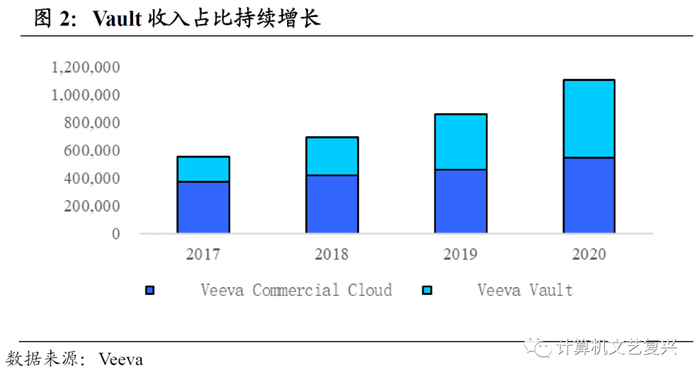 产品整合为商务云和Vault两大部分,Vault逐步成为主要营收来源。产品整合为商务云和Vault两大部分,Vault逐步成为主要营收来源。2017年,Veeva将主要产品整合为商务云(Veeva Commercial Cloud)和Vault两大产品。商务云整合了Veeva CRM多渠道客户关系管理,Veeva Network主数据管理以及Veeva Vault合规内容管理,是一项可交互运作的全球性解决方案。Vault是一个基于云的信息管理平台,对内容、关联资料和实时报表进行整合,可加速文档审批流程,并提高团队效率。Vault应用程序间自带交互功能,从源头确保各个渠道内容的真实一致性。应用到研发领域中,可有效促进临床、质控及监管部门间的合作。它可以部署为跨多个应用程序的集成解决方案,使客户能够在单个全局系统中管理所有重要文档和相关数据。其中,Vault自2014年首次上线以后,逐步成为公司主要营收增长来源。