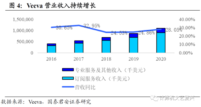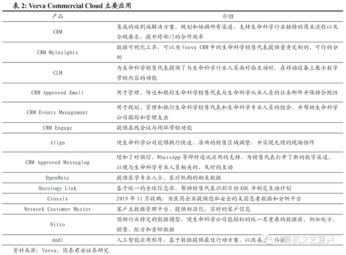 Veeva Systems (VEEV.US)2007年成立,是全球生命科学行业SaaS解决方案领导者。2007年,Veeva针对生命科学行业这一垂直领域提供基于SaaS模式的CRM(创始人有Salesforce(CRM.US)工作背景)。2012年,Veeva推出研发文档解决方案,为研发团队提供数据管理服务,开始横向扩展产品线。2013年,Veeva成功上市,登陆纳斯达克。2014年,Veeva推出商务云套件,打造研发、营销、销售、售后闭环解决方案,形成完整的多渠道营销解决方案。同年,Veeva上线Veeva Vault集成平台,至此形成Veeva商务云和Veeva vault两大主要产品。目前,Veeva市值已经突破100亿美元,成为垂直领域首个市值突破百亿美金的云服务商。