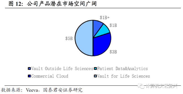 产品市场空间广阔,潜在市场空间超百亿。根据Veeva测算,公司主要产品对应的潜在市场空间(TAM)共计约为100亿美元。其中,生命科学领域Veeva Vault对应的TAM为50亿美元,非生命科学领域Veeva Vault(主要指公司新开辟的消费品、化妆品、化学制品领域)对应的TAM为10亿美元,Veeva商务云对应的TAM为30亿美元,数据分析产品对应的TAM为10亿美元。