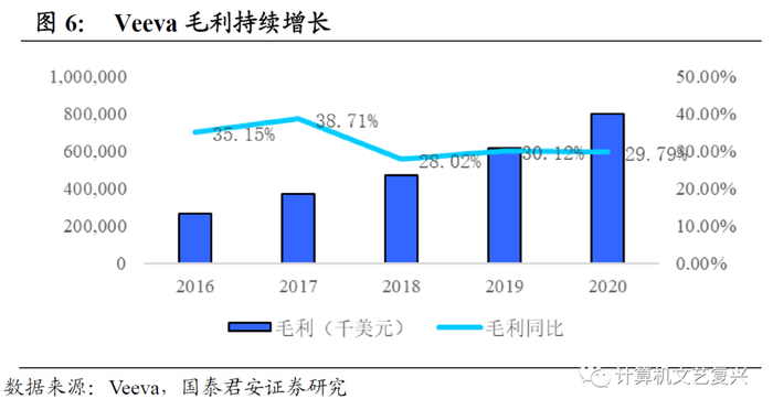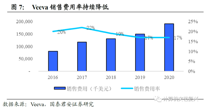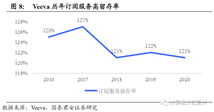 Veeva订阅服务留存率高,支撑销售费用率持续降低。2016-2020财年,Veeva的订阅服务留存率分别为125%、127%、121%、122%、121%,销售费用率分别为20%、22%、19%、17%、17%。保持在120%以上的高留存率反映其订阅服务出色的受认可度,既推动了营收的持续高速增长,也使得Veeva对应的销售费用率持续降低,盈利能力不断增强。