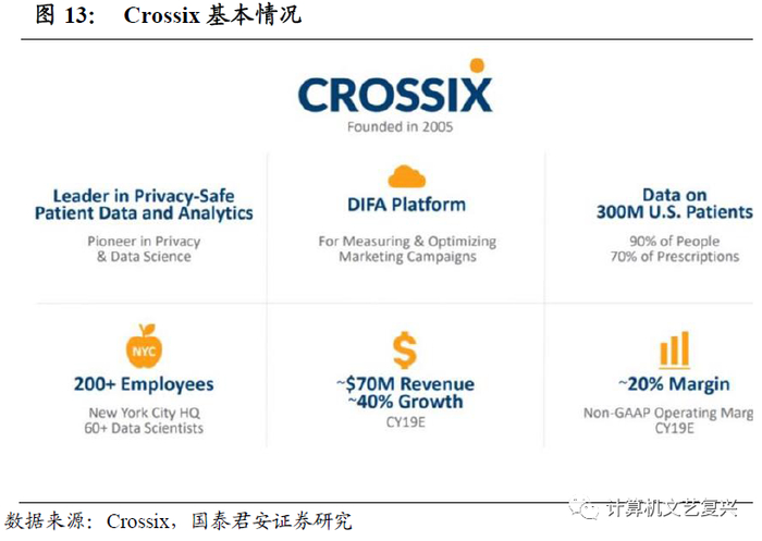收购美国领先的健康数据分析平台Crossix。公司于2019年11月收购Crossix,Crossix的主营业务是为医药企业提供隐私安全的美国患者数据和分析平台,当年收入体量是7,000万美元,同比增速为40%。Crossix与顶级健康品牌合作,通过强大的数据分析功能最大限度地提高媒体和营销效率;连接了业界最全面的健康和非健康数据集,覆盖了美国3亿多人的健康数据;Crossix DIFA™是一流的基于云的平台,可实时测量和优化针对患者和医疗保健专业人员的复杂的跨渠道媒体宣传活动。