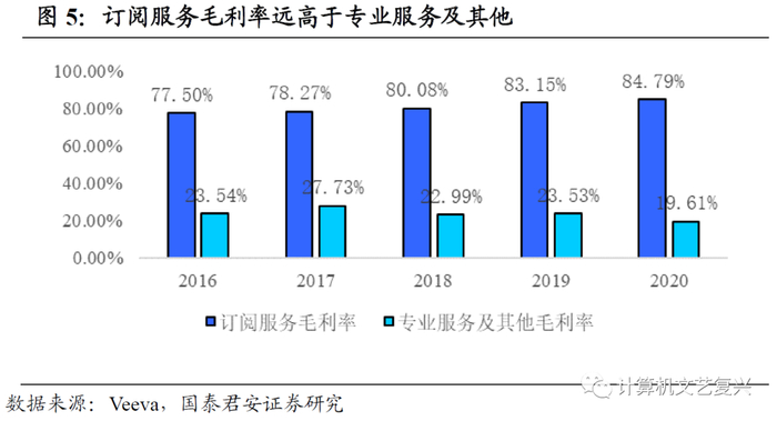 订阅服务收入占比持续增加,收入结构不断优化。从业务模式角度,Veeva收入分为订阅服务收入和专业服务及其他收入。相比于专业服务及其他的20%左右的毛利率,订阅服务属于低成本高营收业务,毛利率较高,约为80%。2016财年,Veeva订阅服务收入占比77.30%;而在2020财年,Veeva订阅服务收入占比上升至81.18%。收入结构的优化,为Veeva营收以及盈利的持续增长提供了有力支撑。