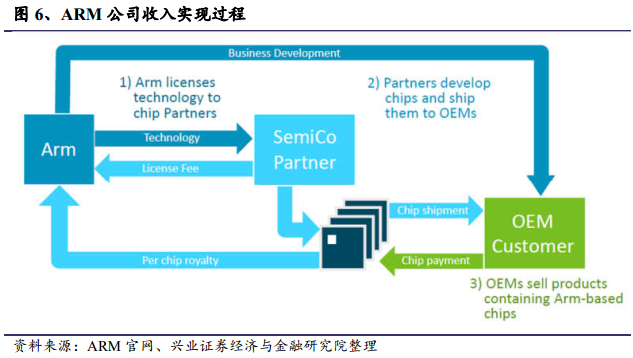 “中立”态度面对全球客户,拥抱芯片产业生态。作为ARM半导体行业上游厂商,ARM面对全球客户都保持中立性,这一态度奠定其纵深方向同步拓展产业生态:全球客户超过500家,遍布全球半导体产业链。以ARM为核心的生态体系是全球最大的生态体系。公司为半导体行业的合作伙伴(如高通、苹果、华为等)提供广泛的合作机会,通过技术授权模式使企业得以便捷高效的开发高性能芯片;其中IC设计公司会将测试封装环节外包至OEM厂商(如台积电等);同时,ARM公司帮助OEM厂商在制程及制造工艺方面进行优化。