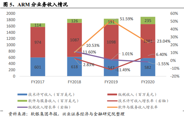 ARM业务结构分为技术许可收入(Technology licensing)、版税收入(Technology Royalties)、软件与服务收入(Software and services)三类。其中,技术许可收入指公司授权ARM知识产权给下游芯片商所收取的一次性授权费用;版税收入指芯片厂商后续销售搭载ARM技术的芯片所需支付的抽成收入。2020年三大业务收入分别为2.4亿、10.8亿、5.8亿美元,同比增长23.0%、6.4%、-1.6%,整体收入以芯片IP出售业务为核心,收入保持稳健增长。