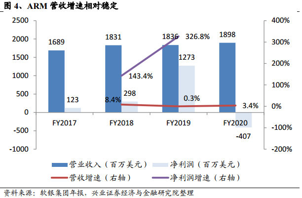 总营收保持稳定增长,20亿美元突破在即。根据软银集团年报显示,2020财年(截止2020年3月)ARM业务实现营收19.0亿美元,同比增长3.4%,近三年以较低增速稳定增长。2020财年实现营业利润-4.07亿美元,亏损主要系ARM中国高达16.7亿美元规模的营业利润无法并表所致,加回后ARM保持高盈利水平。