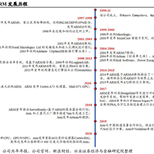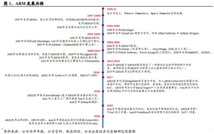成立于1990年,高频收并购联动架构升级。ARM公司成立于1990年11月,总部位于英国。1998年在伦敦和纽交所同步上市,;2016年,日本软银集团以约314亿美元收购ARM,ARM正式退市;2020年,英伟达宣布拟以400亿美元收购软银旗下ARM公司。成立至今,ARM先后大举收购了Micrologic、Allant Software、Infinite Designs、Allant Software一系列IT厂商,研发实力增厚;公司ARM版本持续升级,2011年11月,ARMv8架构面世,首款支持64位指令集的处理器架构。2019年底,ARM的下一代CPU指令集架构(ISA:指令集架构) ARMv9开始推出。