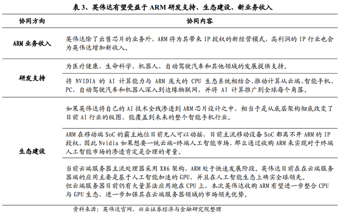 ARM研发投入有望加码,融合GPU技术拓展IP业务范围。根据英伟达公告,本次收购后,英伟达将开发新的软硬件研发方法,加快当前ARM产品研发进程,全面提升ARM研发实力。同时,ARM可借助NVIDIA 在全球先进的GPU技术及产品生态,以及其AI技术,从而拓展原生态之外的IP 组合。