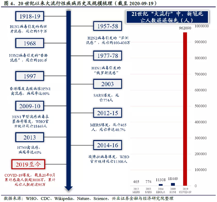 卫生事件已经成为近代流行病史上最大规模的流行病之一,公共卫生事件的持续肆虐和大规模扩散给全球公共卫生领域带来了极大挑战。截至2020年9月19日,COVID-19导致全球超过96万人死亡,是进入21世纪以来最大规模的流行病,造成的死亡人数远超2019年爆发的H1N1甲型流感、2014年爆发的埃博拉(EBOLA)病毒病和2003年令国民“闻风丧胆”的非典(SARS病毒)。即使放眼到整个近现代史(1840年至今),卫生事件导致的死亡人数也仅次于H1N1,历史上H1N1甲型流感卷土重来制造过多次“大流感”,但进入21世纪以后,还未曾引发过导致上百万人死亡的“大灾难”。