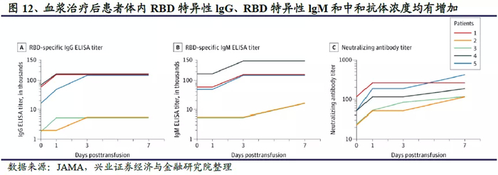 血浆疗法初见成效,但来源有限,不可能大规模使用。除小分子药物外,血浆疗法也初见成效。血浆疗法是把康复者的血浆离心后,取上层血清注射给病人。研究发现,人体感染公共卫生事件的病毒后,一周内会产生IgM抗体,但8-12周后会迅速减少;感染后1-2周会产生IgG抗体,属于中和抗体,在3-4周达到高峰,可持续存在几个月甚至更长时间。因此,血浆疗法的本质是一种抗体疗法,利用卫生事件康复患者血浆中残留的中和抗体治疗其他患者。由于种种限制因素,血浆疗法很难大规模使用。首先,血浆是一个复杂的混合物,有数千万甚至上亿种抗体,里面有具有治疗效果的中和抗体,也有没有疗效甚至其副作用的其他抗体,有效成分的比例比较低;其次,康复者的血浆具有个体差异,输入病人体内有引发排异等副反应的可能性;最后,由于血浆来源有限,主要靠康复者捐赠,很难大规模供应,不能解决全球接近2千万感染者的治疗难题。