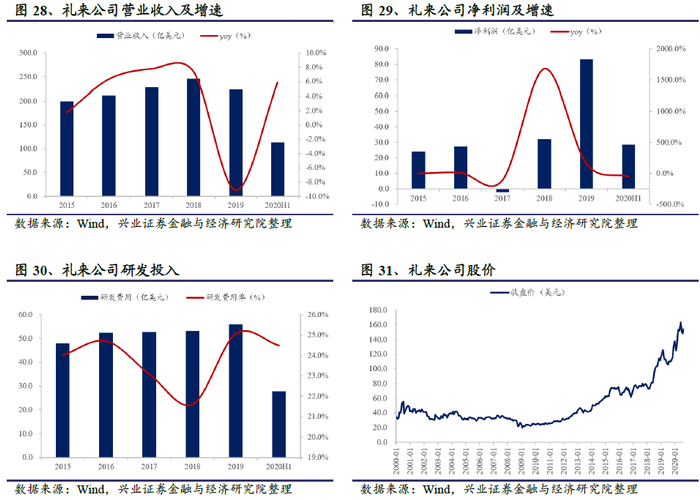 礼来2019年全年实现营业收入223.20亿美元;2020 H1实现营业收入113.59亿美元,同比增长5.87%。近几年公司营业收入已趋于稳定,2015-2019年营收CAGR为2.8%。公司2019年全年净利润为83.18亿美元;2020 H1实现净利润28.69亿美元,同比下滑48.49%。公司2020 H1研发投入为27.82亿美元,占营业收入之比为24.49%。最近五年礼来研发投入稳中有增,CAGR为3.9%,费用率维持在20-25%之间。