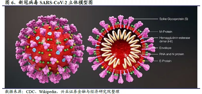 公共卫生事件的病毒具有包膜结构,有4种主要的结构蛋白:其中3种在膜上,分别是膜糖蛋白(Membrane Protein,M)、小包膜蛋白(Envelope Protein,E)和刺突糖蛋(Spike Protein,S);还有1种是与病毒RNA结合的核衣壳蛋白(Nucleocapsid,N)。少数种类还有血凝素糖蛋白(Haemaglutinin-esterase,HE)。S蛋白能够识别并结合宿主细胞表面受体,在介导病毒包膜与细胞膜融合方面有关键的作用;M蛋白参与病毒包膜的形成与出芽过程;N蛋白与病毒RNA结合,是一种具有高度免疫原性的蛋白,参与基因组复制和细胞信号通路的调节。由于N蛋白的序列保守性和强大的免疫原性,常被用于开发冠状病毒诊断检测试剂。HE蛋白则是构成包膜的短凸起,可能与冠状病毒早期吸附有关,某些冠状病毒的HE蛋白可引起红细胞凝集及红细胞吸附。