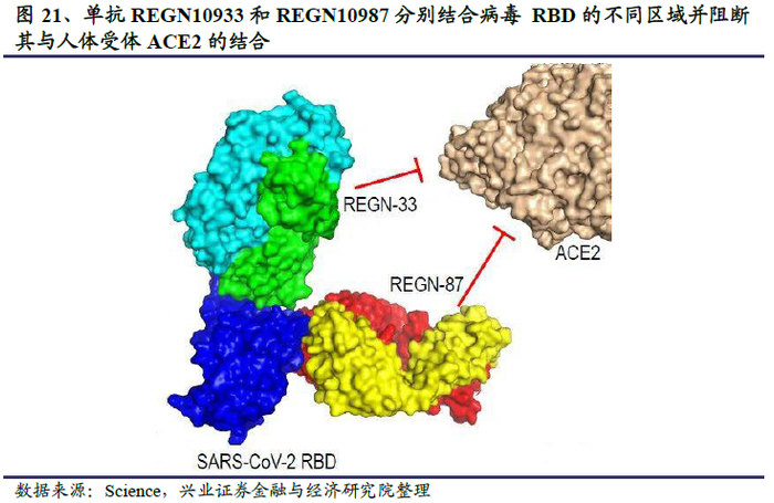 再生元的公共卫生事件的病毒抗体药物名为REGN-COV2,是由REGN10987和REGN10933两个单抗组成的鸡尾酒抗体药物。再生元基于VelocImmune转基因小鼠模型和卫生事件康复患者血液这两条途径初步筛选出200多个候选抗体,最终根据候选抗体和S蛋白的结合能力、中和能力以及三维结构表征等参数筛选出两个最合适的单抗组成“鸡尾酒”疗法。REGN10987和REGN10933非竞争性且同时与SARS-CoV-2病毒S蛋白的关键受体结合域(RBD)结合,阻断病毒RBD与人体细胞受体ACE2的结合界面。其中REGN10933靶向处于ACE2结合界面边缘的刺突样环状区域,REGN10933从上方结合病毒RBD,极大的阻碍了病毒RBD和宿主细胞ACE2的结合;而REGN10987从正面和左下方结合病毒RBD。
