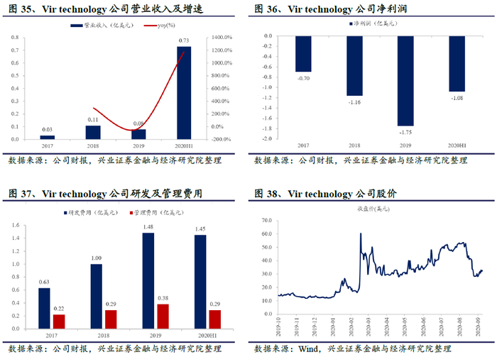 VirBiotechnology 暂无产品获批上市,主要靠非核心业务创收,收入较低且波动较大。2019年全年实现营业收入809万美元;2020 H1实现营业收入7271万美元,同比增长1173.8%。公司2019年全年继续亏损1.75亿美元,2020 H1亏损1.08亿美元。2017-2020 H1公司研发费用分别为0.63、1.00、1.48和1.45亿美元,主要原因是公司处于生物创新药行业,多个在研产品进入临床临床前试验阶段,导致公司研发费用持续增长。