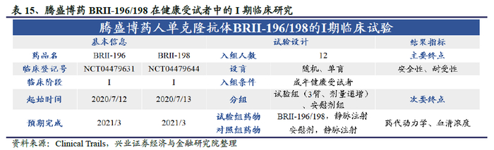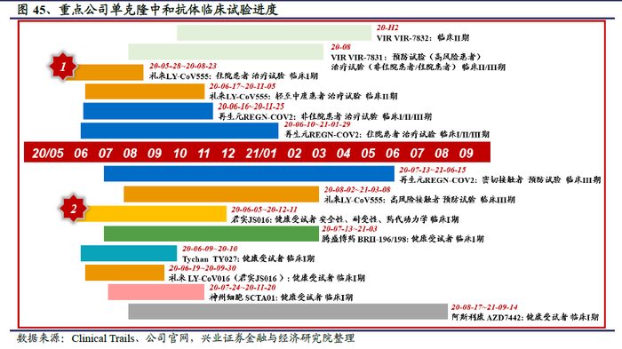 中和抗体的临床研发进展:目前全球共有12个中和抗体项目进入临床,其中进展较快的中和抗体研发项目包括由再生元(Regeneron)公司开发的中和抗体鸡尾酒疗法REGN-COV2,礼来和加拿大AbCellera公司联合开发的中和抗体LY-CoV555,Vir Biotechnology和GSK联合开发的VIR-7831。REGN-COV2和LY-CoV555已进入以预防为目的的III期临床试验阶段,三者均已进入以治疗为目的的II/III期临床试验阶段。国内公司中,君实生物(01877)和中科院微生物所合作开发的JS016领跑,成为中国第一个、全球第二个进入临床试验的病毒中和抗体疗法。