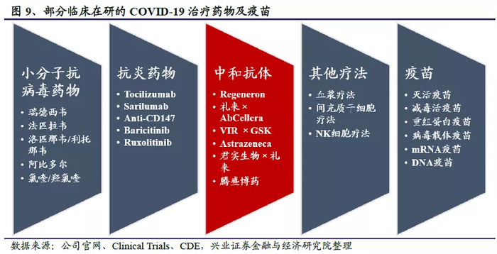 抗炎药物:多个生物药被用于抑制“炎症因子风暴”,例如托珠单抗(Tocilizumab)、西妥昔单抗(Siltuximab)等;也有部分小分子消炎药的临床试验,例如巴瑞克替尼(Baricitinib)、鲁索替尼(Ruxolitinib)等。