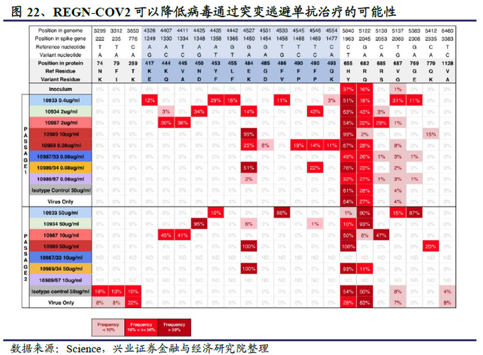 当使用单个抗体进行治疗时,病毒可能会产生多种基因突变逃避抗体的阻断作用,对于结合高度保守区域的抗体也是如此。另一项发表在Science上的研究表明,使用REGN-COV2鸡尾酒抗体治疗公共卫生事件的病毒时,由于REGN-COV2的两种抗体可以同时非竞争性地结合RBD的不同区域,而且病毒同时在两个不同位点发生突变的可能性很小,因此可以降低病毒通过基因突变逃避单抗治疗的可能性。