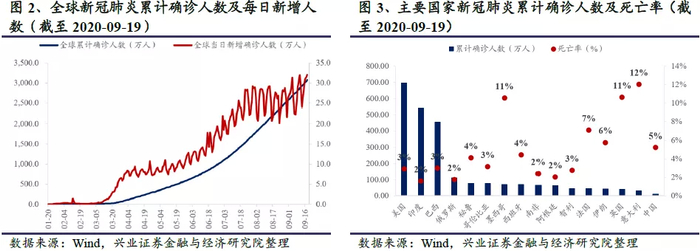 截至2020年9月19日,全球现有卫生事件确诊人数737万人,进入9月以来平均每天新增确认28万人。全球公共卫生事件一波未平一波又起,从1月底最先在国内爆发,至3月初肆虐欧洲,之后美国、巴西、俄罗斯、南非、印度等国家的公共卫生事件都曾经或正在迅速蔓延。此外,部分公共卫生事件控制较好的国家,例如西班牙、法国、英国等欧洲多国,随着复工复产的开始,反弹迹象明显。WHO表示,随着全球卫生事件确诊人数与死亡病例持续飙升,全球距离公共卫生事件结束仍十分遥远。