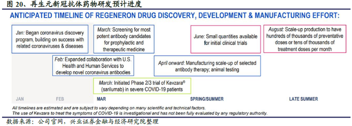 公共卫生事件爆发后,2020年2月3日,再生元宣布与美国卫生和公共服务部(HHS)合作,共同研发针对公共卫生事件的病毒SARS-CoV-2的治疗性抗体药物。根据再生元公司披露的预期进度,3月已经完成预防和治疗性中和抗体的筛选,4月份推进动物实验,6月开始小规模生产,进行初期临床试验;并在8月份扩大生产规模,达到每月几十万份的预防剂量或几万份的治疗剂量。