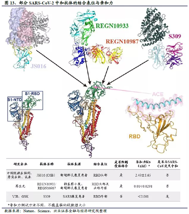 公共卫生事件的病毒中和抗体的最常见的作用机制是靶向病毒S1亚基的受体结构域RBD,阻断RBD与宿主细胞表面ACE2受体结合。考虑到中和抗体要与宿主细胞表面ACE2受体竞争性结合体内游离病毒,因此在亲和力(Affinity)上的基本要求就是要比ACE2更强的结合在病毒S蛋白RBD结构域上,以达到排他的阻隔效果,使病毒无法与宿主细胞受体ACE2结合,防止病毒感染细胞。通常使用平衡解离常数KD表征结合亲和力,KD越小,表明病毒S蛋白和中和抗体结合达到平衡后解离的越少,亲和力越强。体外测得ACE2与公共卫生事件的病毒S蛋白的亲和力常数(KD)在10 nM左右,所以我们保守估计有效的中和抗体亲和力常数应该在1 nM。不过需要注意的是,此处不同研究团队采用的是不同的靶标和不同检测方法得到的结果,不应简单进行绝对数值大小的比较。