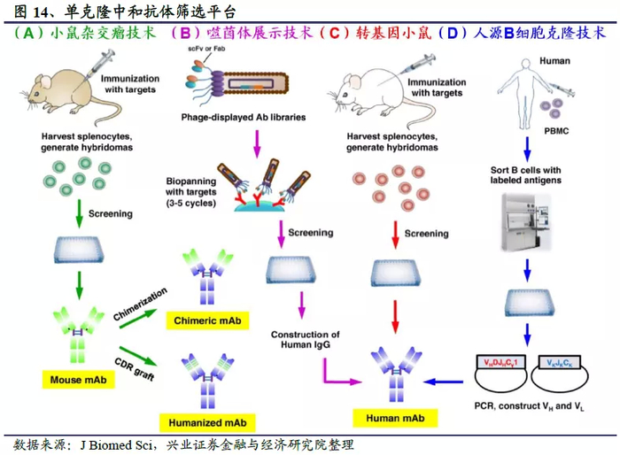 二是通过向动物模型注射病毒S蛋白,激发中和抗体的产生,这类技术的典型代表为再生元制药及和铂医药。再生元基于VelocImmune转基因小鼠平台和卫生事件康复患者血液这两条途径初步筛选出数百个全人源中和抗体,最终选择REGN10933和REGN10987组成抗体鸡尾酒REGN-COV2,但再生元并没有指出这两者哪一个来自小鼠平台、哪一个来自康复患者。和铂医药等开发广谱中和抗体47D11利用的是H2L2全人源转基因小鼠技术平台,体外实验证实47D11对SARS-CoV和SARS-CoV-2都具有中和活性。