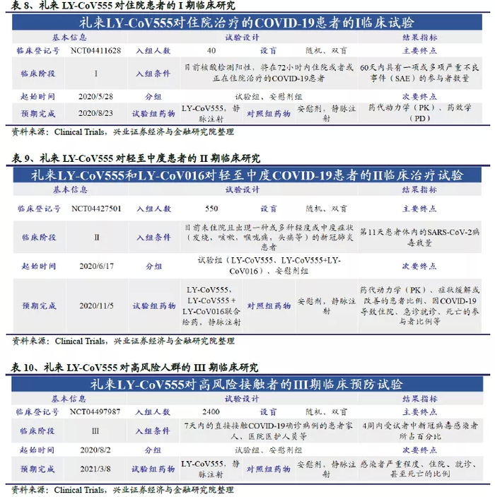 2020年5月礼来与君实生物签订中和抗体合作开发协议后,2020年6月19日,礼来已启动JS016(LY3832479)在美国的I期临床试验,计划在24名健康参与者中以单次静脉注射剂量评估LY3832479的耐受性,安全性,药代动力学和免疫原性。随后,礼来启动LY3832479针对轻至中度COVID-19患者的II期临床治疗实验,评估其与LY-CoV555联合给药时缓解或改善患者临床的情况。