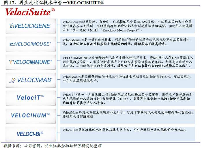 VelociSuite®技术平台用于发现、开发和生产人的单克隆抗体,并提高单克隆抗体的生产效率,核心优势是能够简化抗体药物的研发工艺并提高抗体新药的研发品质。VelociSuite®技术平台由VelociGene、VelociMouse、VelocImmune、VelociMab、VelociT、VelociHum和Veloci-Bi七部分组成。VelocImmune是其中最为核心的技术,用于生产全人源单克隆抗体,作用原理是通过将人类基因片段注入到小鼠体内,多快好省地产生出以人类基因为基础的单抗,也就是优化的全人源抗体,从而降低抗体的免疫原性,被誉为“有史以来最伟大的哺乳动物基因工程”。此外,VelociGene能够快速、自动化编辑产生目标基因或高度定制化的基因,VelociMouse用于培育原代胚胎干细胞小鼠,VelociMab用于快速筛选抗体和快速生产表达细胞系。