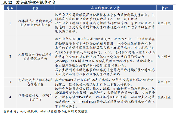 君实生物已自主研发建立了涵盖蛋白药物从早期研发到产业化的整个生命周期的完整技术体系,包括七个主要的技术平台:(1)抗体筛选及功能测定的自动化高效筛选平台,(2)人体膜受体蛋白组库和高通量筛选平台,(3)抗体人源化及构建平台,(4)高产稳定表达细胞株筛选构建平台,(5)CHO 细胞发酵工艺开发平台,(6)抗体纯化工艺及制剂工艺开发与配方优化平台,(7)抗体质量研究、控制及保证平台。其中,抗体筛选及功能测定的自动化高效筛选平台、人体膜受体蛋白组库和高通量筛选平台、高产稳定表达细胞株筛选构建平台和抗体质量研究、控制及保证平台为公司的核心技术平台。