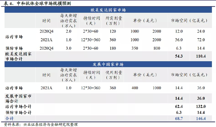 印度、巴西等发展中国家每日新增确诊20万人,因为今年底之前中和抗体将在发达国家市场上供不应求,所以只考虑公共卫生事件持续到2021年时发展中国家的治疗需求。
