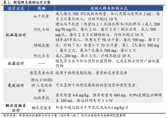 目前卫生事件没有“特效药”,常规治疗手段为“肺炎基础疗法+抗病毒药物+抗炎药物”。根据国家卫健委8月中印发的《公共卫生事件的诊疗方案(试行第八版)》,对于一般患者,多采用供氧治疗与加强支持治疗的方式;对重型、危重型患者则在抗病毒治疗的基础上,针对不同临床表现的患者使用康复患者血浆、免疫球蛋白等免疫治疗或糖皮质激素治疗等其他治疗手段。但总体来说,在没有卫生事件“特效药”的情况下,目前采用的治疗手段大体是“肺炎基础疗法+抗病毒药物+抗炎药物”的思路,其余附加治疗方法依照患者病情进展酌情使用。