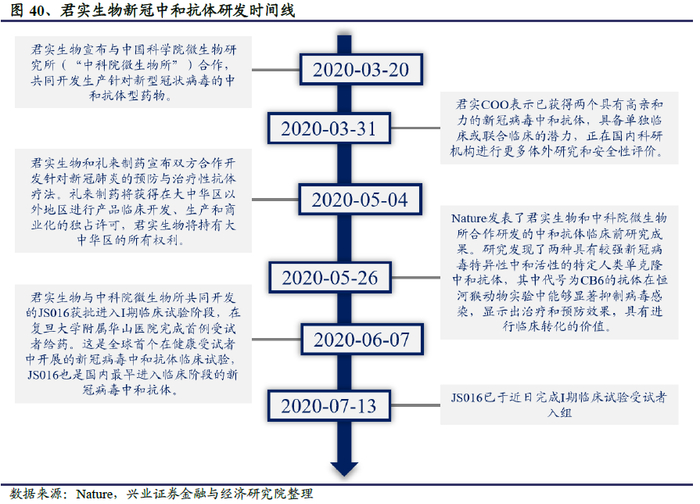 从进度上看,从中科院微生物所2月初从康复期病人内筛选出全人源单克隆中和抗体到6月初进入临床试验,君实生物JS016单克隆中和抗体的临床前研发仅用时4个月。JS016是国内首个、全球第二个进入临床人体试验阶段的潜在中和抗体药物,7月7日已完成受试者给药,预计9月能获得初步结果。