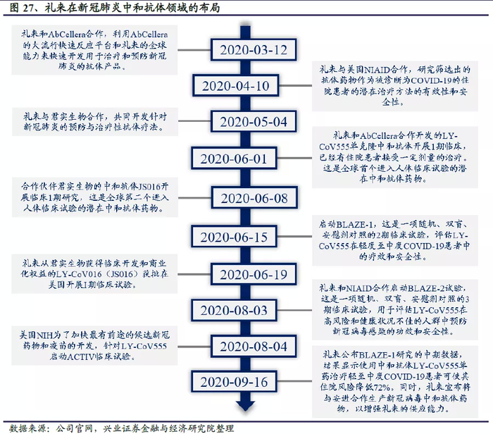 礼来在卫生事件中和抗体领域主要有两项布局:一是和加拿大生物技术公司AbCellera合作开发了LY-CoV555,二是投资最高2.55亿美元购买君实生物JS016大中华以外地区的临床开发和商业化权益。其中LY-CoV555于6月1日宣布进入I期临床,与君实生物合作开发的JS016于6月7日获批进入I期临床,分别是全球第一、第二个进入临床试验阶段的潜在中和抗体。目前来看,礼来参与的两个中和抗体项目最先进入I期临床试验,或成卫生事件中和抗体研发的最大赢家。JS016的研发及临床进展将在君实生物部分详细介绍,这里重点介绍礼来和AbCellera合作开发的LY-CoV555。