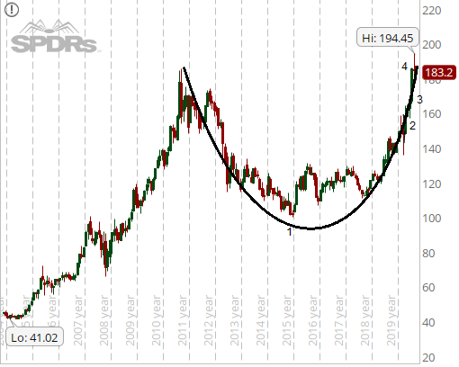 ②2020年1月8日,他在黄金月线图中初步确立杯柄形态。
