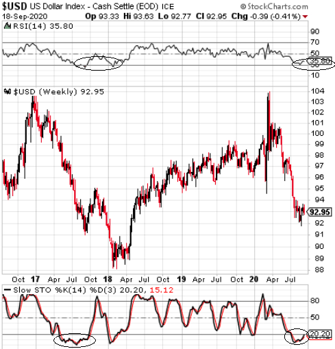 以此为鉴,当前美元的下跌周期始于今年3月,且已经持续了6个月。在此期间,美元从104跌至91,然后小幅反弹。目前,周线图中的RSI和STO指标均已从超卖状态中反弹。